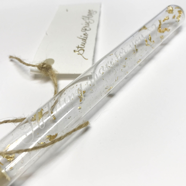 Handgegraveerd in glazen reageerbuisje gevuld met vlokken 23,75 krt bladgoud.